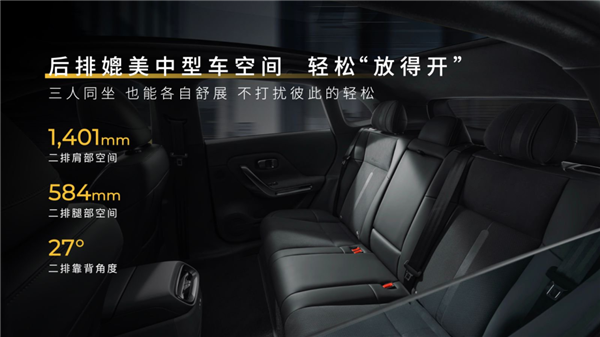 其次是解决了两厢车后排坐三人时略显拥挤的痛点,按照零跑的说法,有着同级最宽的后排空间,肩部空间能达到 1401mm,媲美凯美瑞,坐在后排,你很难相信这只是一辆 4.4 米的小车。