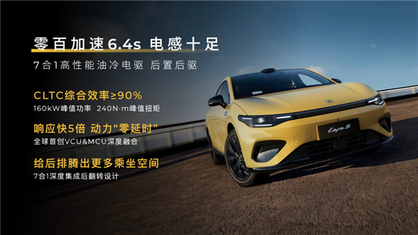 零跑Lafa5采用后置后驱布局,搭载七合一高性能油冷电驱系统,除入门版电机最大功率是132kW外,其余车型电机最大功率均为160kW,峰值扭矩 240N·m,最快零百加速能达到6.4秒。这个数据虽然算不上狂暴,在燃油车里,这一加速水平足以达到了“小钢炮”的标准,已经比高尔夫GTI的6.9秒还要快。